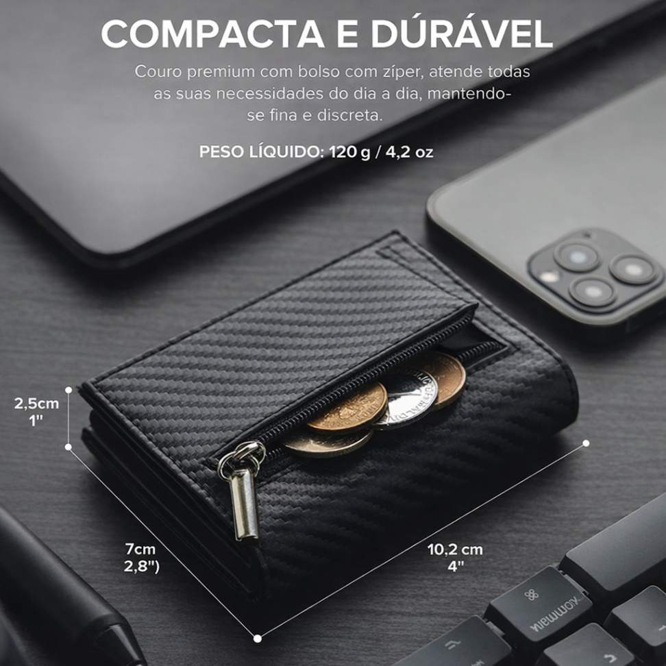 Produzida em couro premium com textura em fibra de carbono, a carteira DIENQI é resistente, durável e ideal para uso diário. O bolso com zíper garante segurança extra para moedas e pequenos itens, enquanto o fechamento magnético proporciona abertura e fechamento rápidos e práticos.