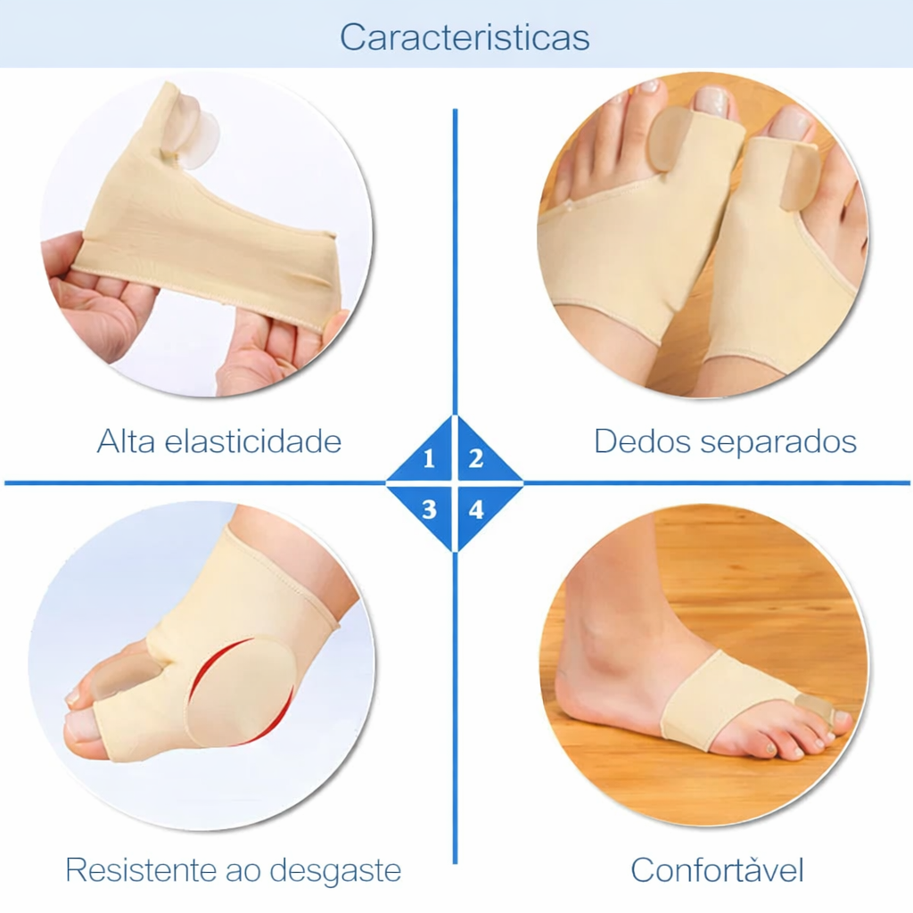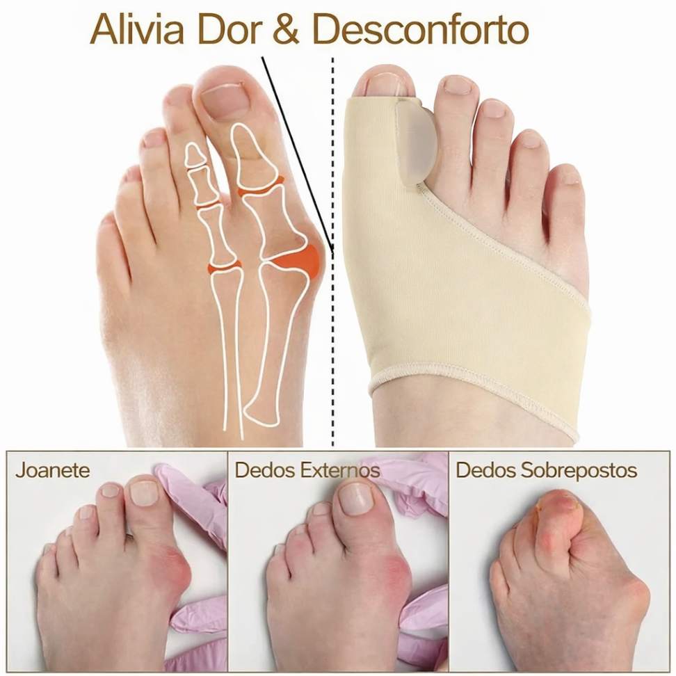 Seu design anatômico com separador de dedos auxilia na correção gradual do joanete (hálux valgo), diminuindo a pressão nas articulações e prevenindo o agravamento do problema. Pode ser usado com ou sem calçados.